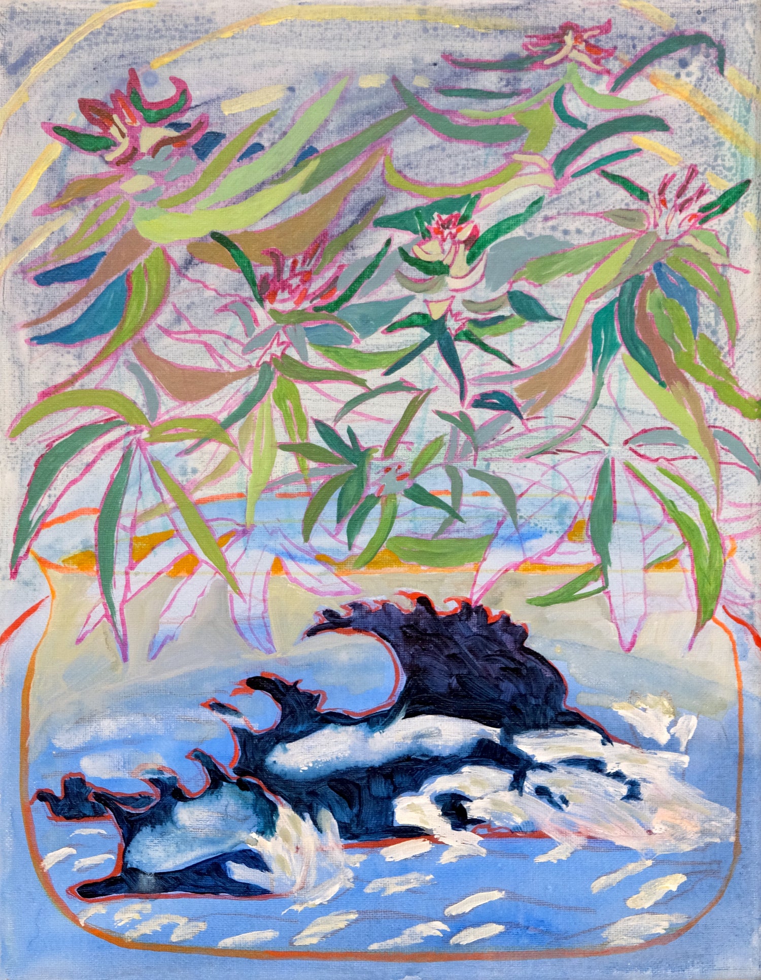 A Personal Ecology will present a collection of paintings within an expanded installation featuring driftwood, suspended branches, shelves, and handmade objects, such as ceramics, sewn forms, and decorative ephemera. These elements create spatial arrangements that highlight, amongst other things, interconnectedness and impermanence. Together, the works form a personal ecology, an environment shaped by observation, care, and reflection, noticed along the way.